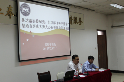 5月21日,后勤管理处组织全体党员及班组长以上干部进行廉政教育学习,党委书记张文超传达了《中共燕山大学纪委、党委组织部关于重申严禁婚丧喜庆大操大办有关规定的通知》,要求后勤管理处全体干部职工认真学习《通知》精神,严于律己,杜绝违法违纪现象发生。