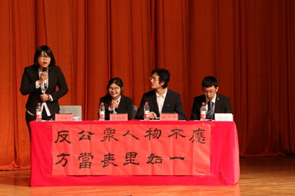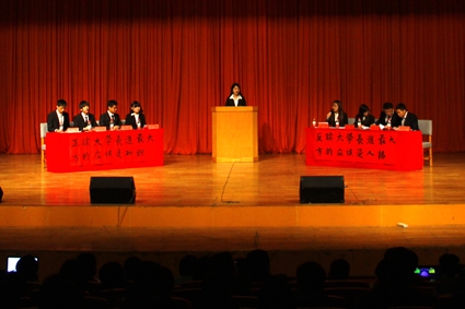 精彩的开场视频拉开了决赛的帷幕,电气工程学院代表队同建筑工程与力学学院代表队角逐第二十届“潮汐杯”辩论赛冠军,双方就“读大学,长进最大的应该是知识还是人格”展开辩论。正反双方围绕社会需要满腹经纶的人才还是健全人格的人才进行激烈的辩论,双方辩手旁征博引,列举了牛顿、爱因斯坦等著名科学家的事例来论证自己的观点。无论是质询对辩环节还是自由辩环节,双方辩手都紧紧围绕自己的论点,抓住对方的观点中的漏洞,据理力争,现场掌声不断。决赛过后,清华大学辩论队与我校辩论队就“公众人物应不应该表里如一”展开了辩论。双方辩手你来我往,紧扣辩题,一针见血地指出对方辩手语句中的错误,为观众带来了一场精彩的“唇枪舌战”。